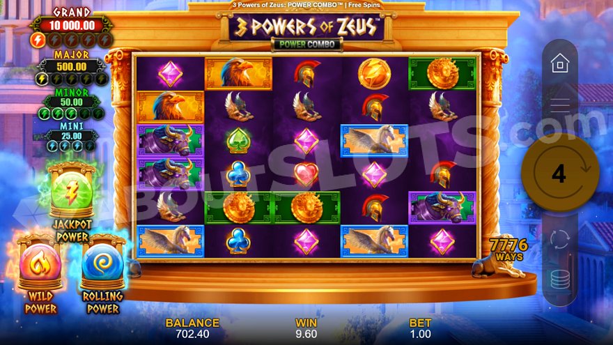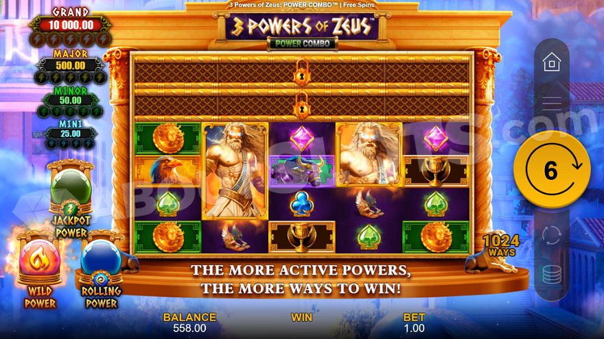 The 3 Powers of Zeus: Power Combo slot immerses players in the world of ancient Greece. The game interface features structures with large columns, reminiscent of classical architecture.