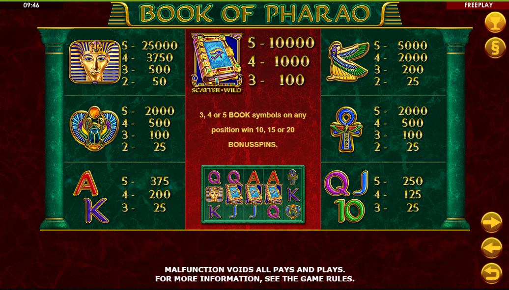 The title of this slot game clearly indicates its inspiration. Ancient Egypt stands as a consistently popular theme within the realm of slot games. From movies to literature and the extensive history of Egypt, this subject resonates with a wide audience. Drawing inspiration from this rich source, the developer has created Book of Pharao, an Egyptian-themed slot designed to provide engaging gameplay. Book of Pharao is structured as a video slot featuring a 5-reel layout, incorporating 10 paylines and 3 rows of symbols. This game is designed to offer a captivating experience with its iconic symbols and opportunities to achieve substantial wins. You can enjoy playing Book of Pharao and many other exciting slots at .