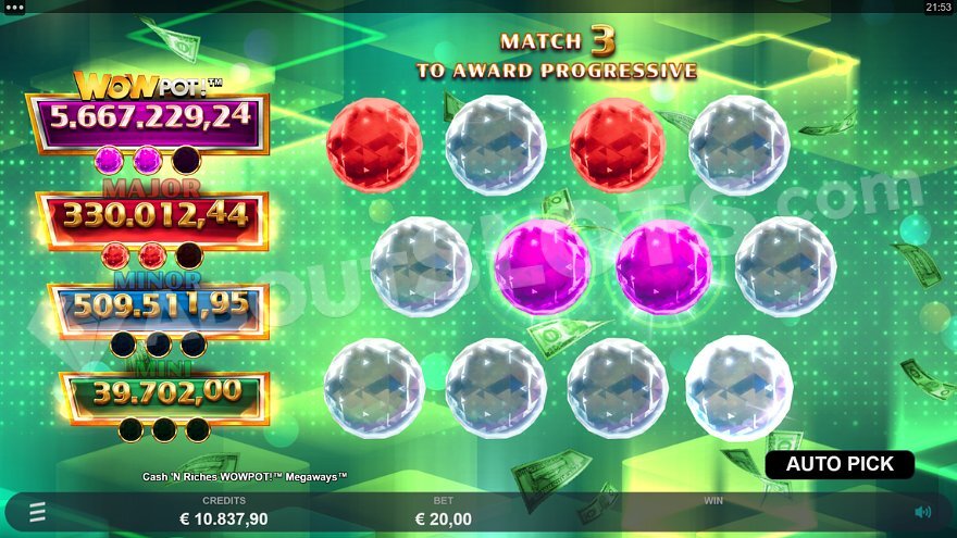 The Jackpot Pick Game is a high-reward feature in Cash ‘N Riches. In the Wowpot version, it’s a central attraction. This game can activate randomly after any spin in the base game and during free spins. The probability of activation increases with the number of wild symbols collected, and also with a higher bet level.