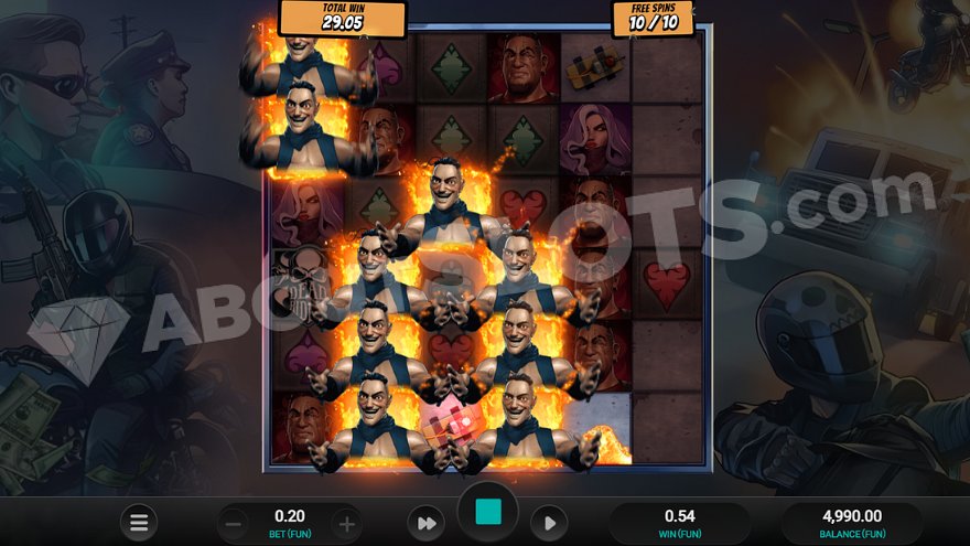 Dead Riders Trail opens with an impactful animation sequence, setting the stage with a modern video game aesthetic. The scene features an armored vehicle and a female character in biker attire who triggers an explosion, destroying the vehicle. The main game interface presents a 6×6 grid, populated with symbols of bandits, stone blocks, and card suits. The backdrop is dynamic, showcasing bikers and armed figures alongside law enforcement vehicles like police cars and helicopters. Adding to the atmosphere, dollar bills float in the air, complemented by a soundtrack reminiscent of the Fast & Furious film series.