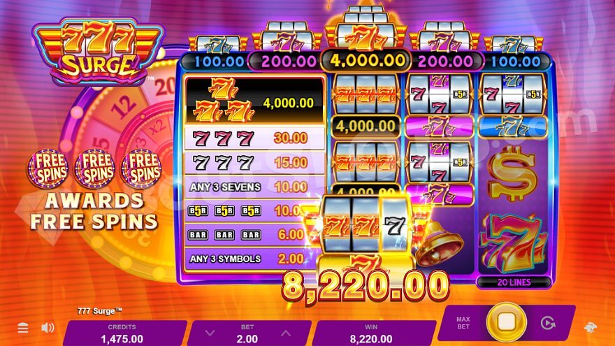 777 Surge distinguishes itself through a blend of classic slot aesthetics and modern, innovative mechanics. While it features familiar symbols like sevens, bars, bells, and cherries on a traditional 5x3 reel grid, the game incorporates several exciting features to enhance gameplay. The most notable of these is the Mini-Reel Bonus, triggered by landing three or more Mini-Reel Bonus symbols, which can award significant multipliers, up to 2000x your bet from the yellow mini-reel. Furthermore, the Free Spins feature, activated by Scatter symbols, offers a chance to spin a wheel for up to 30 free spins and a multiplier up to 5x, applied to all wins during the free spins round. The combination of these features, along with the potential for a maximum win of 6546 times your stake, makes 777 Surge a compelling and potentially highly rewarding slot game experience.
