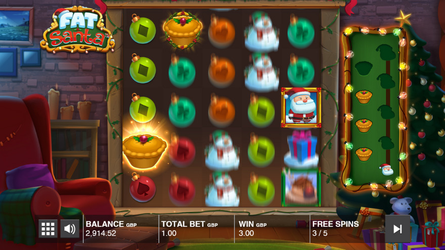 Trigger the Free Spins feature by landing a Santa symbol along with one or more Pie wild symbols on the reels. This awards an initial 5 free spins. During free spins, the Santa symbol remains on the reels and becomes an expanding wild. When Pie symbols appear, Santa moves to consume them, filling a meter located to the right of the reels. Filling this meter leads to Santa growing in size and awards additional free spins. Progressing through levels by feeding Santa pies enhances win potential as he occupies more reel positions.