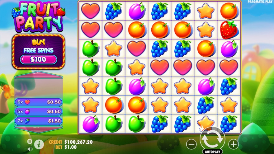 The game’s design centers around a fruit theme, with a green, jelly-like backdrop for the reels. The 7×7 grid dominates the screen. A Bonus Buy option is located to the left of the reels, and recent win displays are at the bottom. Fruit Party is optimized for play across various devices, including mobiles, tablets, and desktops. Forming a winning cluster requires five or more identical symbols in adjacent positions.