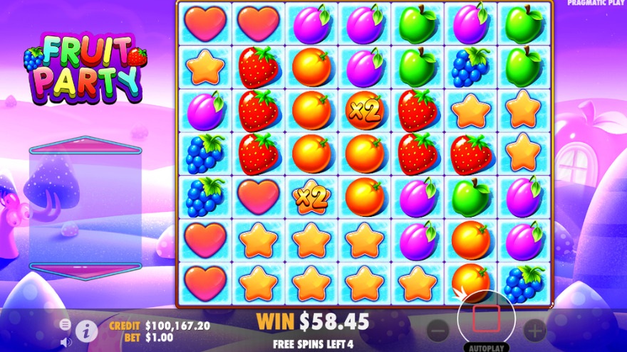 To enhance win opportunities, Fruit Party includes several key features. These are the Tumble feature, Random Multiplier, Free Spins, and the Bonus Buy option.