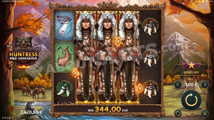 Lower-value symbols are represented by beast teeth icons in single, double, triple, and quadruple formations. Landing five of these symbols results in a payout ranging from 0.8 to 1 times the stake. Higher-value symbols include animal paw, waterskin, moccasins, eagle, fox, and bear icons. Achieving five of the same high-value symbols awards between 1 and 20 times the stake. The scatter symbol is depicted as an open landscape with the word “BONUS,” and the huntress herself acts as the wild symbol. The following sections detail the game’s features.