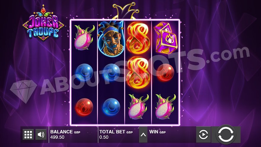 The game includes six paying symbols. The lower-value symbols are represented by a blue ball, red ball, star fruit, and dragon fruit. These symbols offer payouts ranging from 1 to 3 times the stake for landing four on a payline. The higher-value symbols include a pair of dice, awarding 50x the stake for four symbols, and a gold ‘figure 8’ symbol, which pays 100x the stake for the same combination. There is no wild symbol in Joker Troupe. Instead, the game features three scatter symbols: the Red, Green, and Blue Jokers. Additionally, special symbols appear in the form of Joker Hats during the Blue Joker Hat Feature. The Blue Hats range in value, with the least valuable blue hat starting at 0.10 times the stake and the most valuable gold hat reaching 5 times the stake.