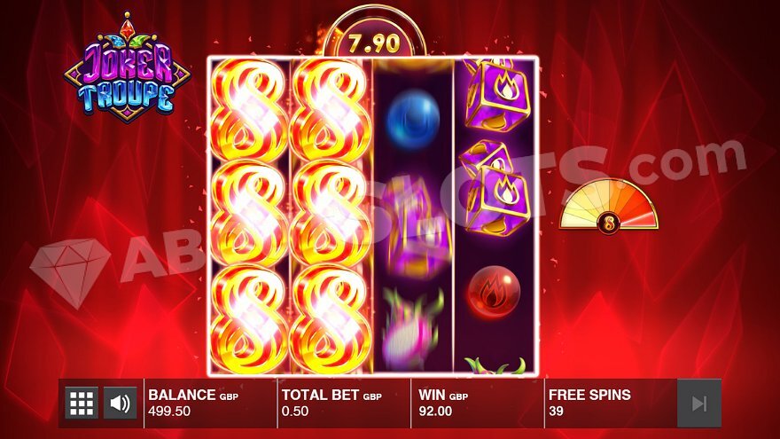 The slot includes a total of six paying symbols, a suitable number for the 12 reel positions. The lower-value symbols are represented by blue balls, red balls, star fruits, and dragon fruits. These award payouts ranging from 1 to 3 times the stake for landing four symbols on a payline. The higher-value symbols include a pair of dice, offering a 50x stake payout for four symbols, and a golden ‘8’ symbol, which provides a 100x stake for the same combination. Notably, Joker Troupe does not include a wild symbol but features three scatter symbols: the Red, Green, and Blue Jokers. Additionally, special symbols in the form of Joker Hats are central to the Blue Joker Hat feature. The Blue Hats range in value, with the least valuable blue hat starting at 0.10 times the stake and the most valuable gold hat reaching 5 times the stake.