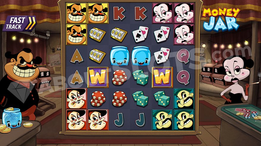 Money Jar transports players to a 1930s comic casino atmosphere. The game interface is set against a backdrop of slot machines with animated eyes. On the right side of the reels, a Betty Boop-style character with a cigarette, dressed in a black dress and red gloves, adds to the vintage vibe. To the left stands a smiling, stout man. The soundtrack features a jazz melody with a prominent bass line, enhancing the overall ambiance. Winning combinations are formed by landing at least 3 matching symbols on adjacent reels, starting from the leftmost reel. Money Jar is designed for compatibility across devices, accessible on mobile phones, tablets, and desktop computers. For players looking to try their luck, 1xbet offers a platform to play this engaging slot.