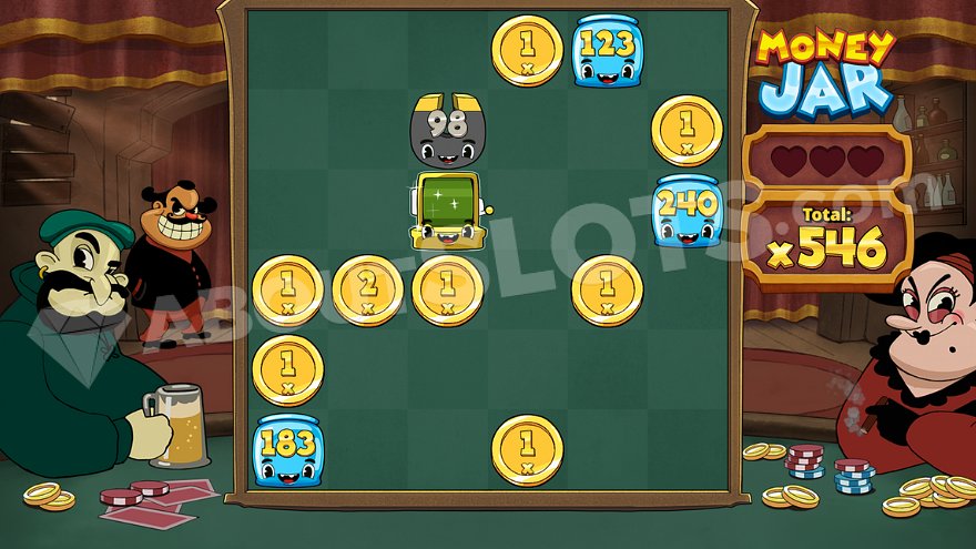Triggered by landing 3 or 4 Money Jar Scatter symbols anywhere on the reels, the Bonus Game begins with 3 lives. Each spin reduces the life counter by 1. A casino chip symbol with a heart refills the counter back to 3 lives. The game concludes when the player runs out of lives (spins). The triggering money jars remain on the grid, while the remaining positions spin, revealing empty spaces, coins, or special symbols. Jars collect all adjacent coins on every spin and can move positions. They also collect values from each other if adjacent. The extra life symbol, wherever it lands, restores 3 spins.
