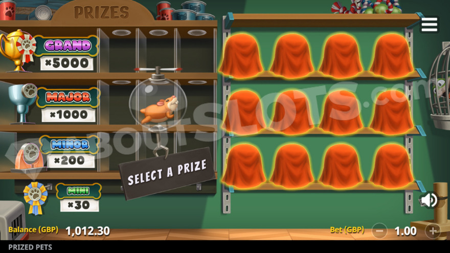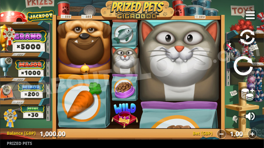 The Jackpot Bonus can activate randomly by collecting bone symbols. Upon activation, players are taken to a new screen. Here, you select from 12 hidden trophies. Matching 3 identical trophies awards the corresponding Jackpot. The available jackpots include Mini, Minor, Major, and Grand, paying out 30x, 200x, 1000x, and 5000x the bet respectively. The Jackpot Bonus adds an element of surprise and the chance for significant wins while playing Prized Pets Gigablox at 1xbet.
